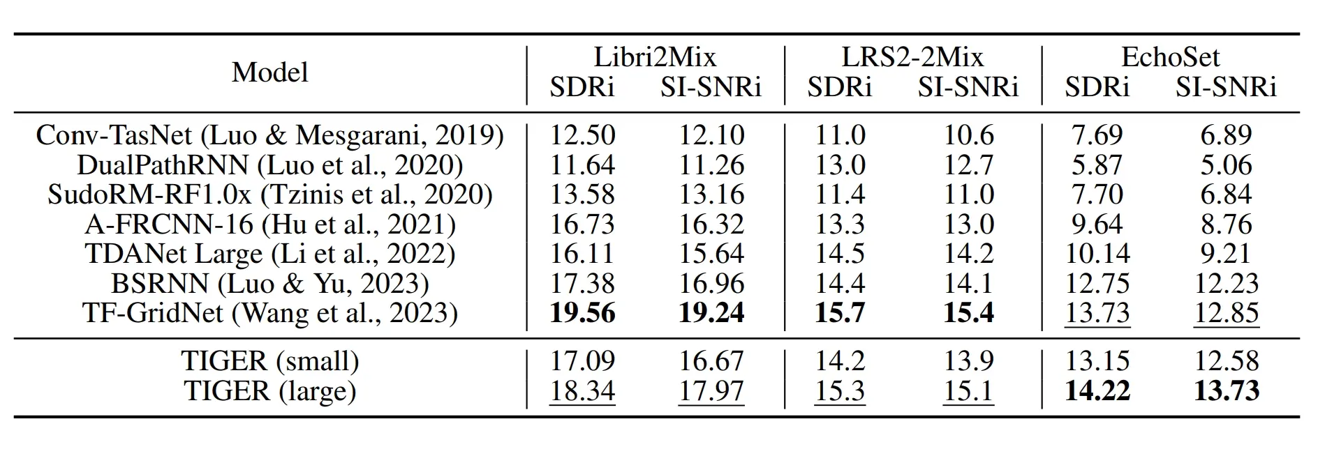 - 性能提升:在EchoSet数据集上,TIGER(large)的SDRi达到14.22 dB,超越了现有的SOTA模型TF-GridNet。