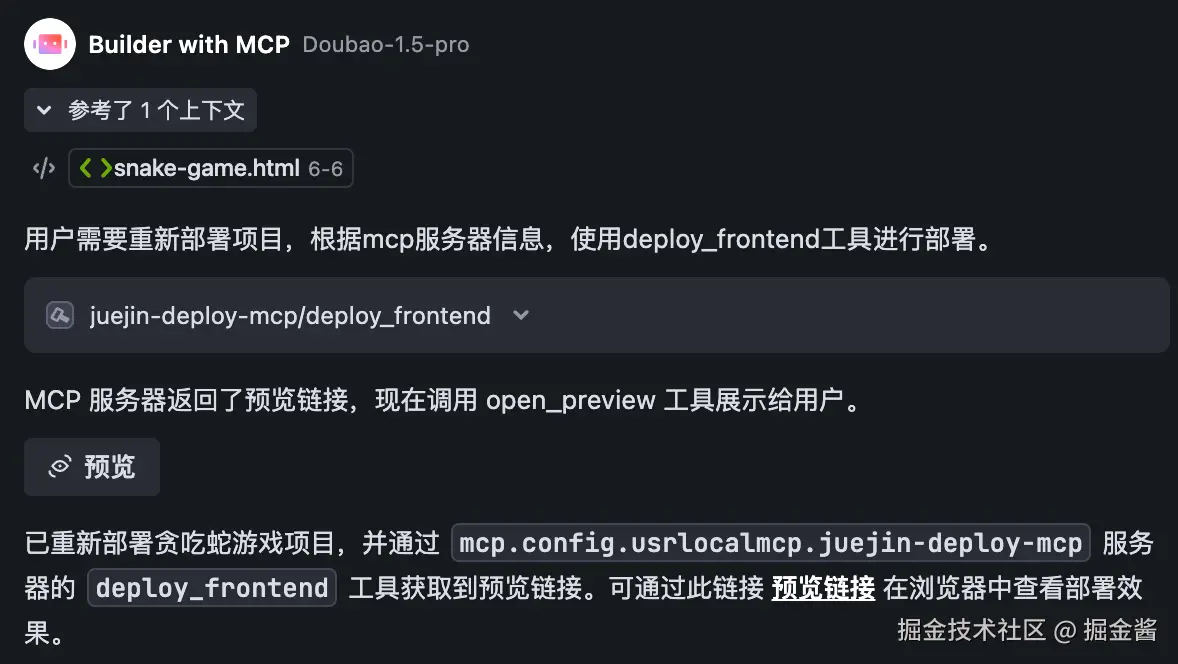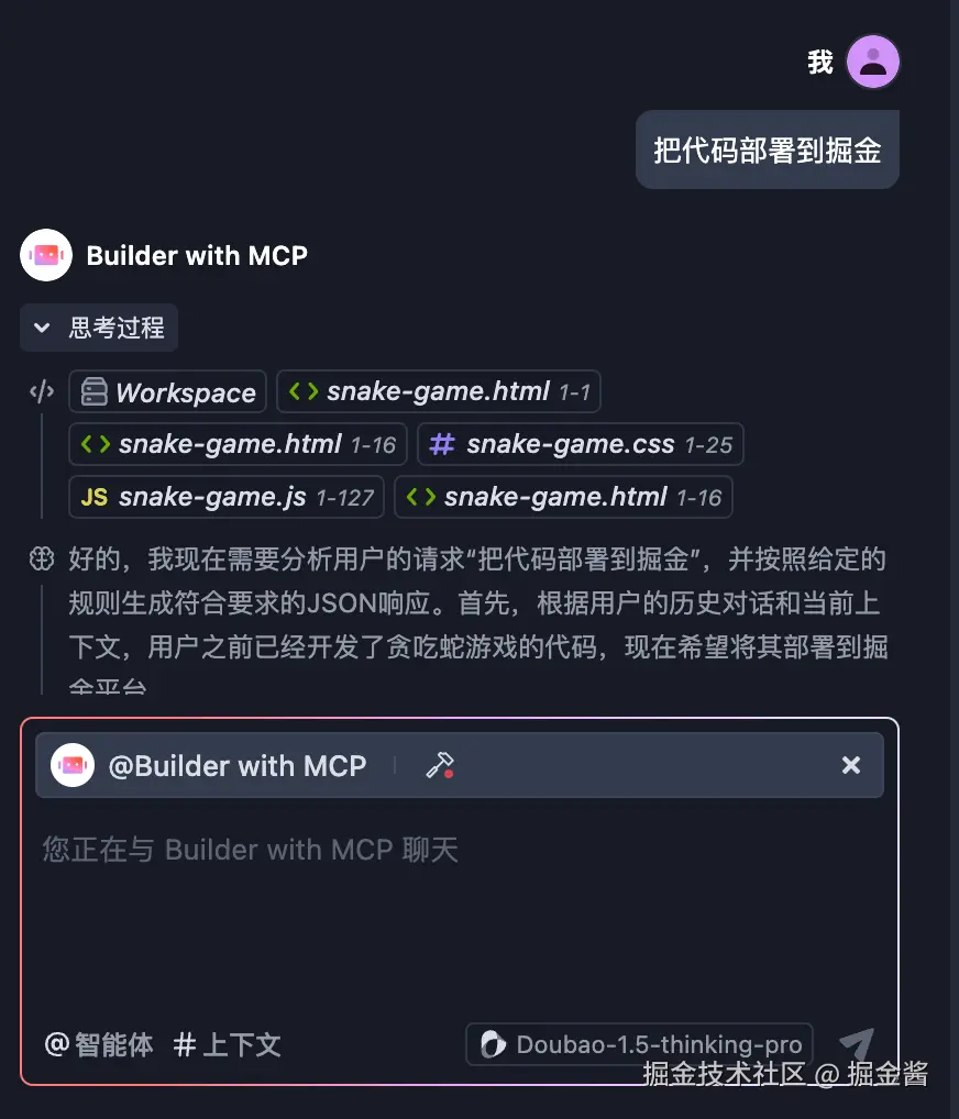 在开发过程中,我们常常需要将自己制作的小项目(如 HTML/CSS/JS 小游戏、落地页等)快速展示给他人。如果你是掘金用户,并且使用支持 MCP(Model Calling Protocol) 的 AI IDE(如 Trae),那么你可以通过以下步骤,实现一键部署并发布你的作品到掘金平台。