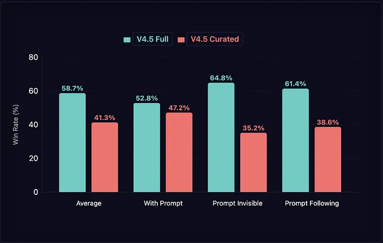 在一组由用户参与的盲测实验中,我们比较了 V4.5 Curated 和 V4.5 完整版 的图像生成效果,涵盖以下三种任务: