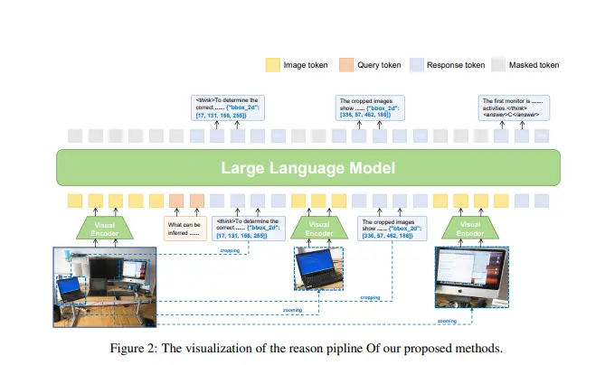 - 交互式推理管道:模型在推理过程中可以动态地选择和处理图像区域,如裁剪和放大,以获取更详细的视觉信息。处理后的图像区域被编码为视觉标记并附加到模型的输入序列中,为模型提供新的上下文。