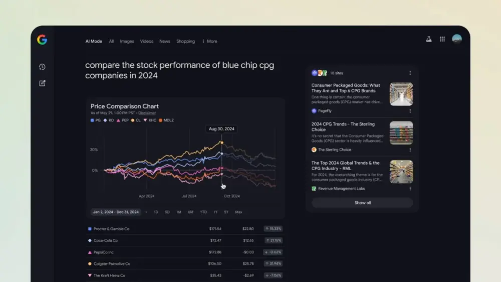 在2025年谷歌I/O大会上,谷歌宣布对其搜索AI模式进行重大升级——新增数据可视化与自定义图表生成能力,特别针对金融领域查询进行了优化。这一更新标志着搜索引擎正从“信息检索”向“智能分析+决策辅助”迈进。