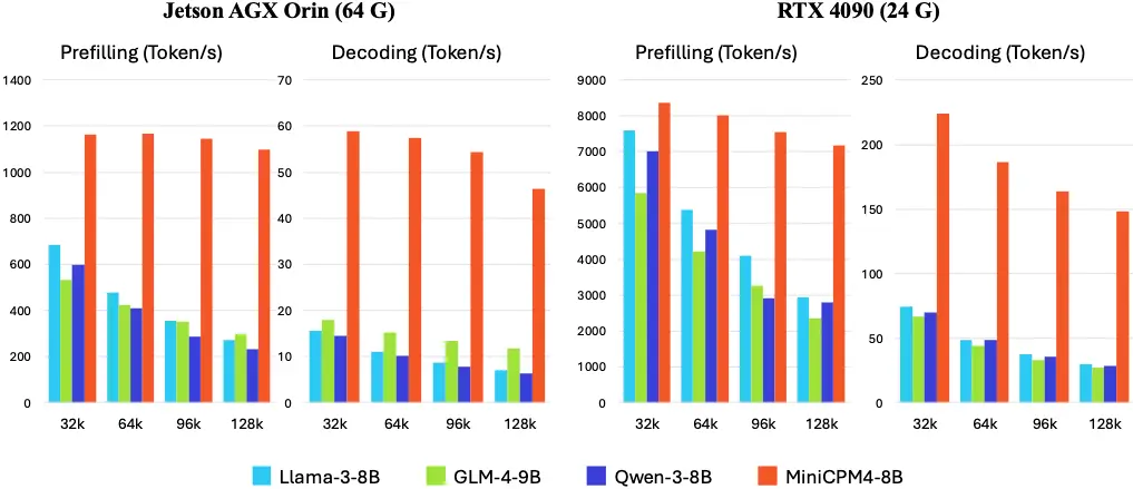 在典型端侧芯片上的测试结果显示,MiniCPM 4.0 在长文本处理任务中表现出远超同类模型的性能优势:
