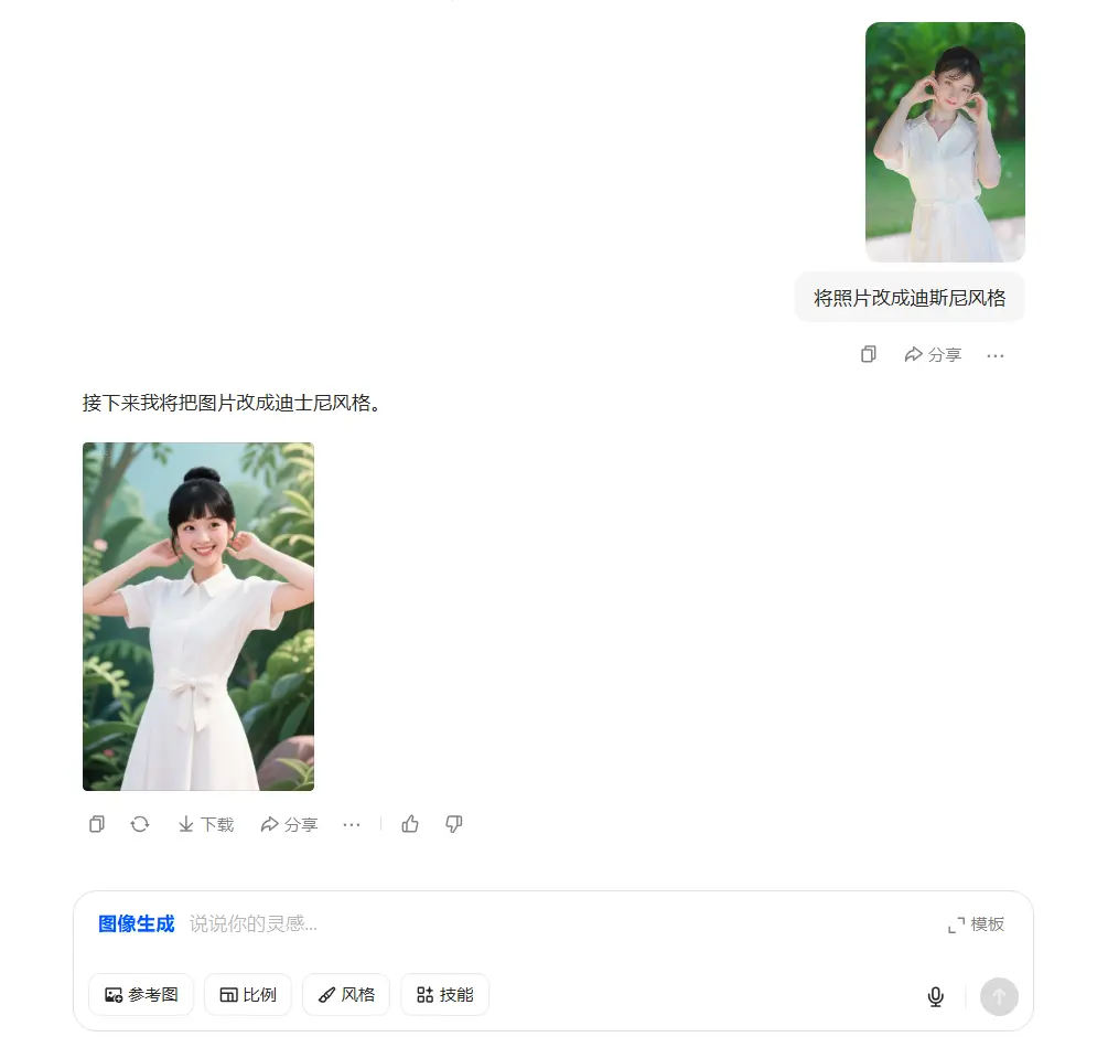 如果你希望把照片变成艺术画作,豆包也提供了强大的图像风格迁移功能。只需指定目标风格(例如油画、素描、卡通风等),AI 即可将原始图像自动转换成你想要的艺术效果,同时保留画面主体不变。