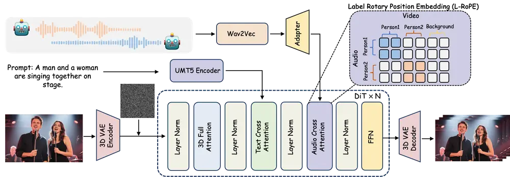 - 音频与人物绑定:通过 Label Rotary Position Embedding (L-RoPE) 方法解决多音频流与人物的正确绑定问题。