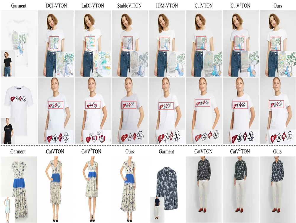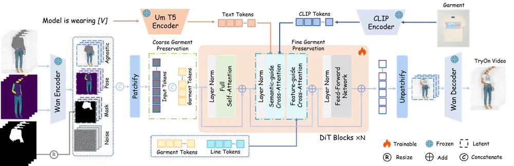 - 细粒度保留:在去噪阶段引入语义引导交叉注意力(SGCA)和特征引导交叉注意力(FGCA),分别注入服装的全局语义和局部细节信息。