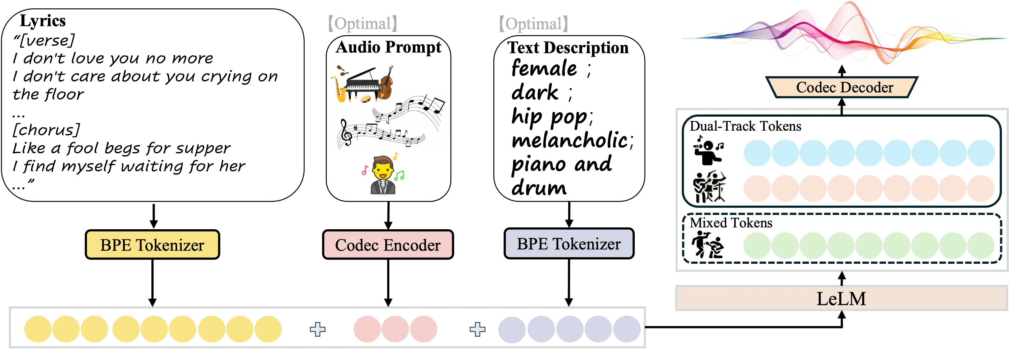- 双轨道令牌(Dual-track Tokens):分别编码人声与伴奏,以提升音质和音乐性。