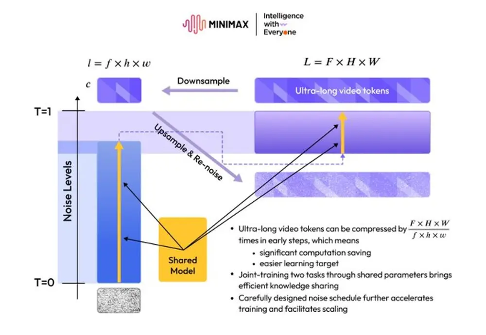 为了提升视频生成效率,同时控制成本,MiniMax团队开发了一种全新的模型架构——噪声感知计算重分配(Noise-aware Computation Redistribution, NCR)。