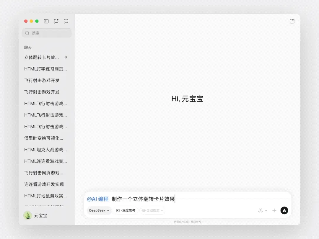 用户在电脑版选择 DeepSeek V3 模型 并关闭深度思考模式后,只需输入“@AI 编程”,即可进入双栏界面。左侧用于对话生成代码,右侧则可实时展示并预览运行结果,无需反复切换窗口,大幅提升编写效率。