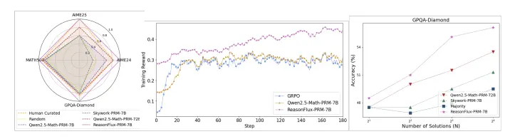 - 轨迹感知奖励建模:ReasonFlux-PRM能够对模型的中间思考轨迹和最终响应进行细粒度奖励分配,提供与结构化链式思考数据对齐的奖励信号。