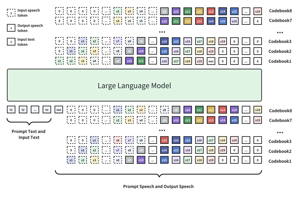 - 在 XY-Tokenizer 编码基础上,采用自回归加多头 Delay 的方式生成语音 token