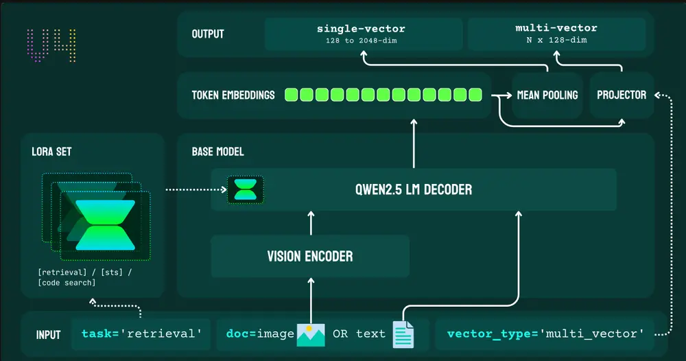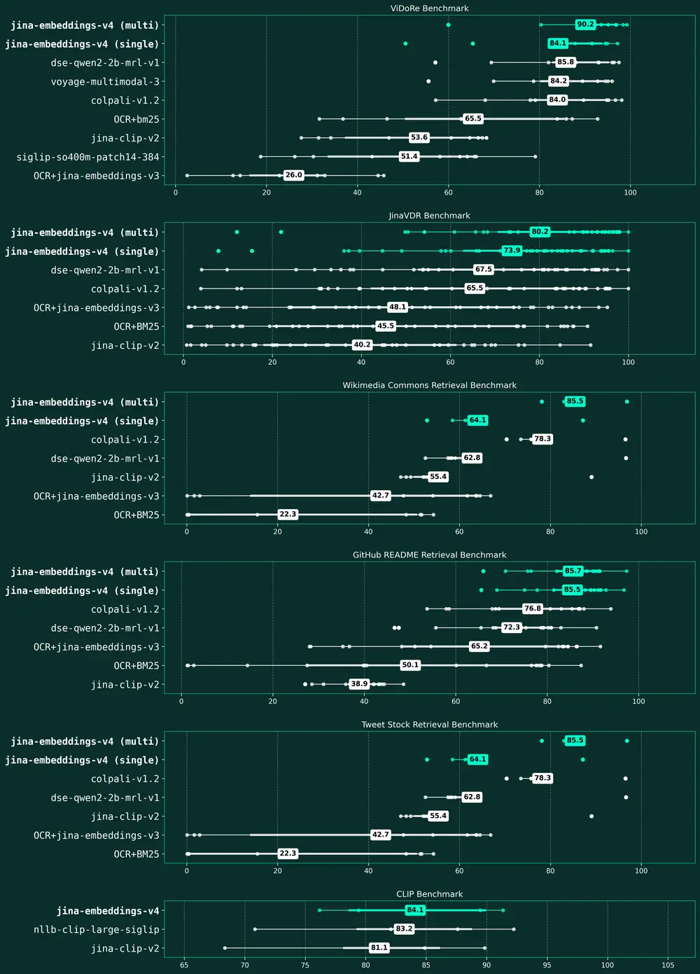 Jina AI正式发布 jina-embeddings-v4 —— 一款全新的38亿参数通用嵌入模型,支持文本与图像输入,适用于多种检索任务。该模型在多个基准测试中表现优异,特别是在处理表格、图表等视觉丰富内容方面展现出强大能力。