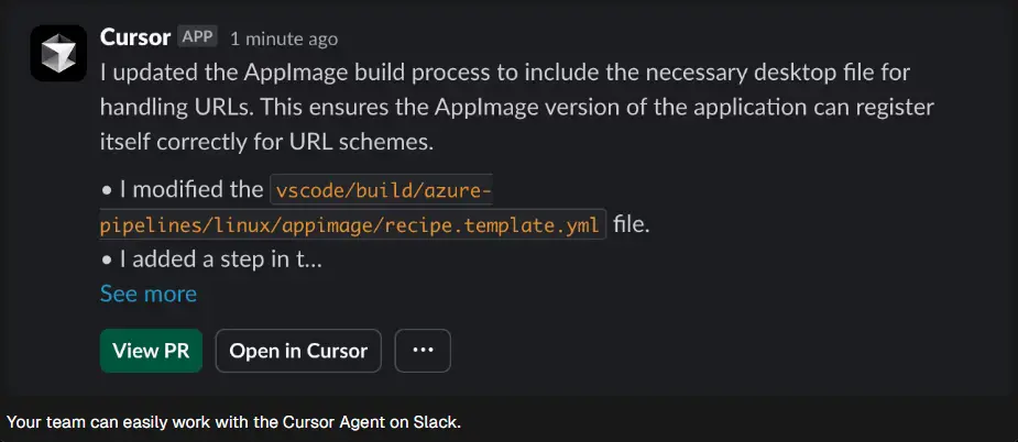 Cursor 已深度整合 Slack,实现双向互动: