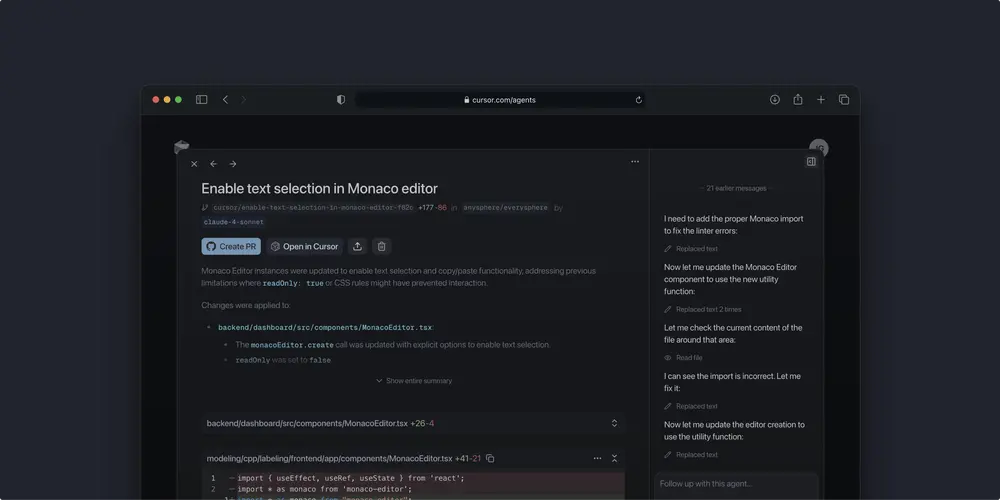 Cursor 的网页应用不仅是一个远程控制界面,更是一个完整的智能体工作台,具备以下核心功能: