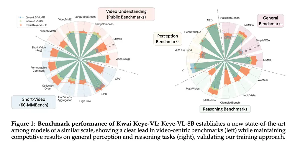 Kwai Keye-VL-8B 凭借其强大的感知能力,在多个权威基准测试中表现优异: