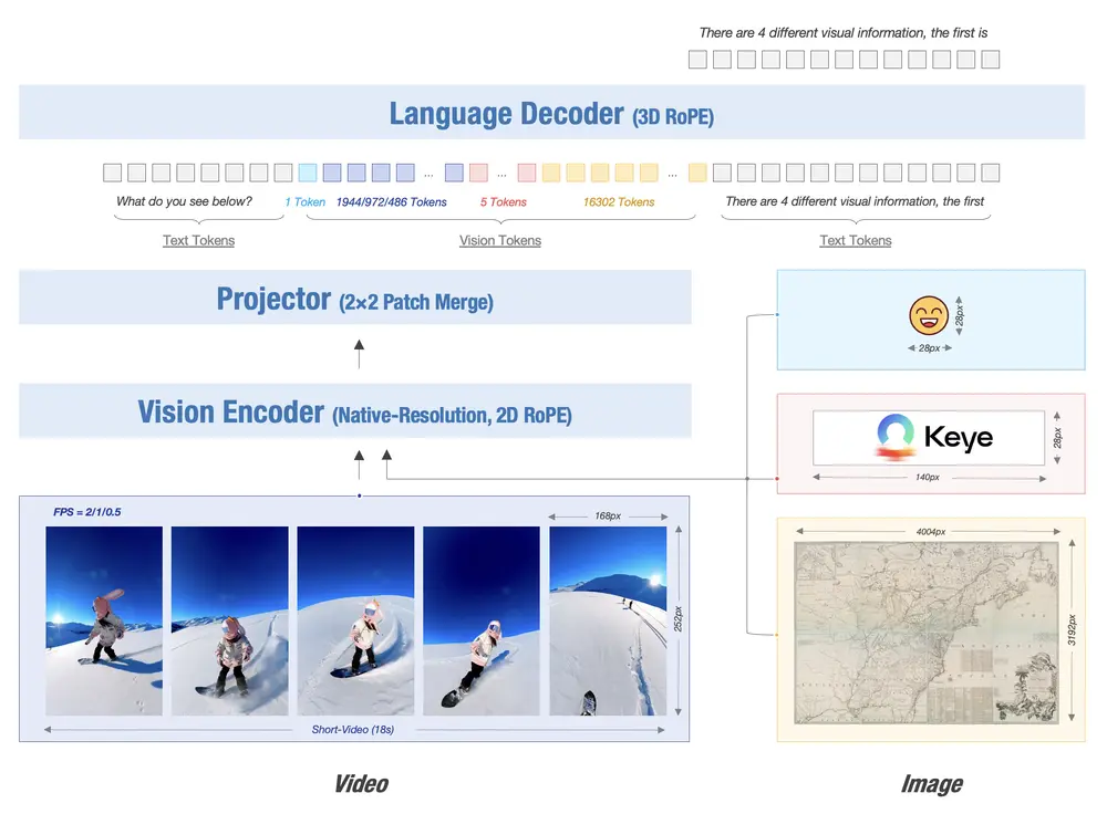 Kwai Keye-VL 基于 Qwen3-8B 语言模型构建,并集成了从开源 SigLIP 初始化的视觉编码器。该模型支持原生动态分辨率,通过将每张图像分割为 14x14 的 patch 序列来保留原始图像的纵横比。