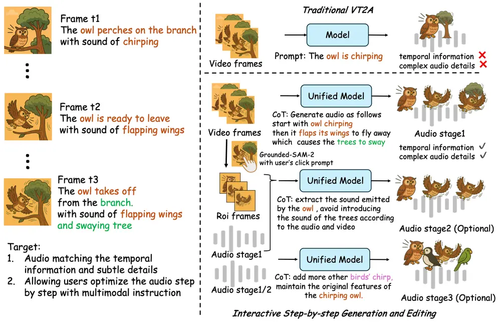 - 交互式对象编辑:用户可通过点击视觉对象或使用自然语言指令细化特定声音;