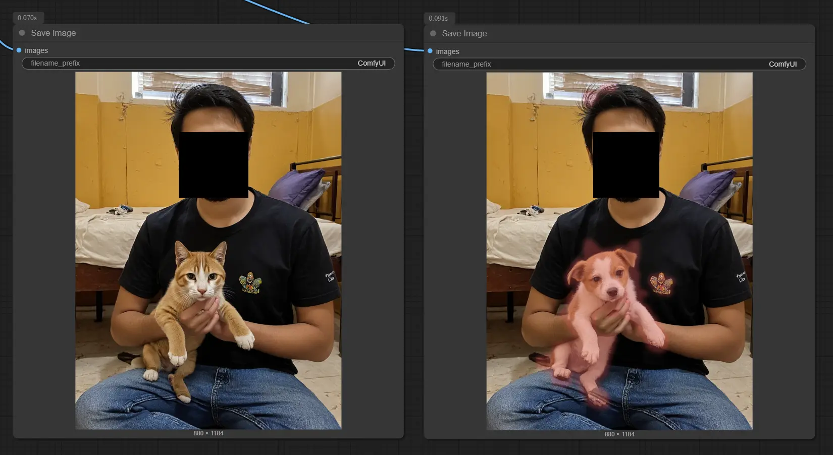 - 示例 2:将狗替换为猫后,背景等未改动区域无任何失真。