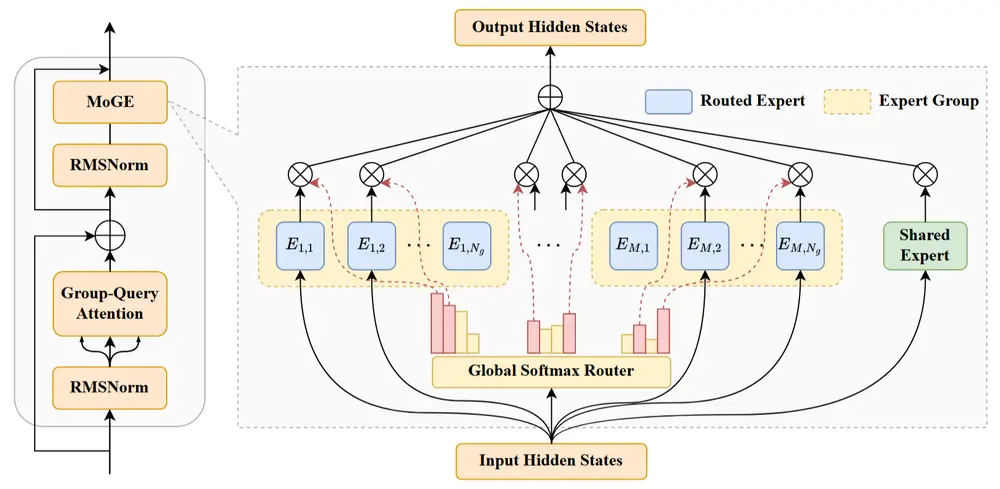 传统 MoE(Mixture of Experts)模型存在设备间负载不均衡的问题,影响训练效率。为此,华为提出了 MoGE 架构,其核心思想是: