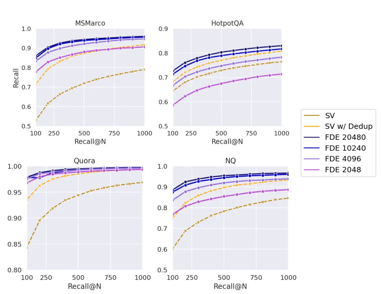 - 优秀的压缩性能:FDE 支持产品量化压缩,内存占用减少 32 倍,且对检索质量影响极小。