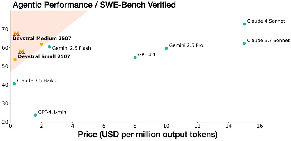 全新 Devstral Small 1.1 以 Apache 2.0 许可证发布,是开源代码代理模型中的最先进代表。Devstral Medium 通过我们的 API 提供,在成本/性能帕累托前沿上设定了新标杆,性能超越 Gemini 2.5 Pro 和 GPT 4.1,且价格仅为其四分之一。