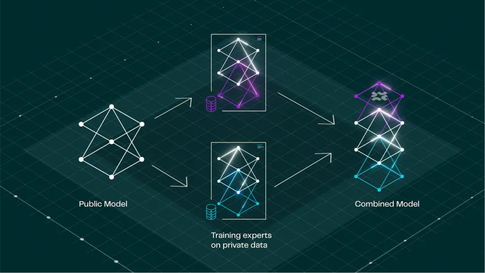 每个数据拥有者都可以从公共模型中本地分支,基于自己的私有数据训练一个“专家模块”,再将该模块贡献回共享模型中。