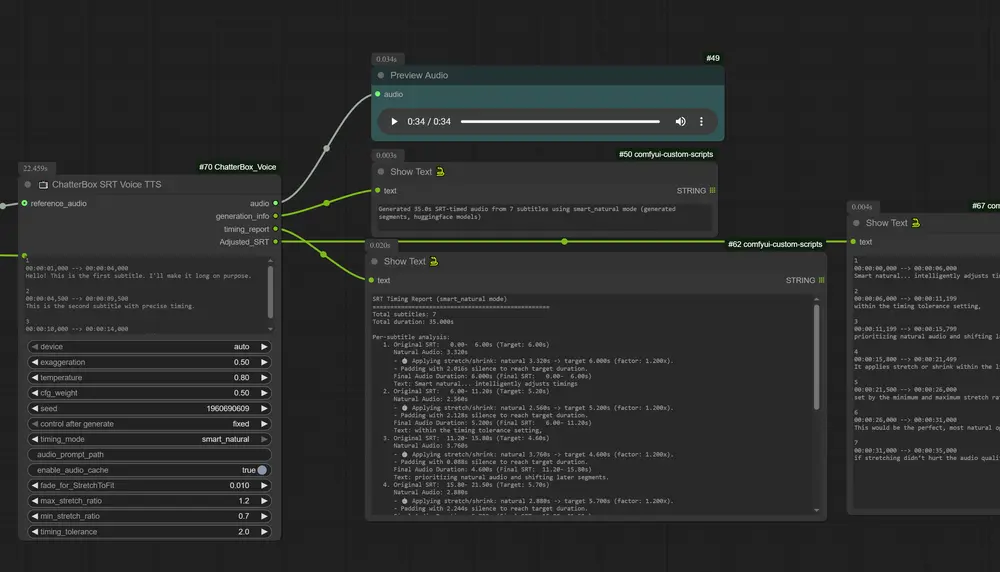 ChatterBox SRT Voice TTS 节点通过解析 SubRip 字幕(SRT)文件进行 TTS 生成,确保输出音频与字幕时间轴精确对齐。