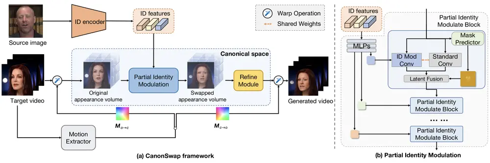 研究人员认为,现有方法之所以在动态一致性方面表现不佳,是因为面部外观与动作信息是高度耦合的。为此,CanonSwap 引入了规范空间变换(Canonical Space Transformation)机制,将动作信息与外观信息进行解耦,从而实现在统一空间中进行更精准的身份替换。
