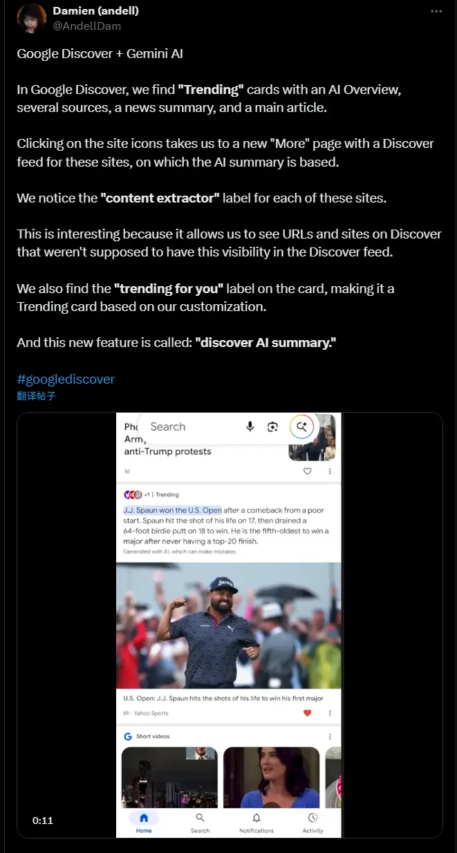 虽然早在今年6月,就有用户发现谷歌在Discover中尝试类似AI概述的卡片设计,但谷歌官方现已确认,此次更新是面向美国用户的正式上线,并非实验性功能。