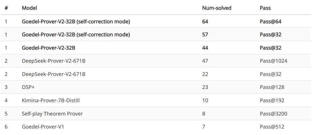 在更具挑战的 PutnamBench 数据集上,Goedel-Prover-V2-32B 在自我纠正模式下以 Pass@64 解决了 64 个问题,位居排行榜首位,远超 DeepSeek-Prover-V2-671B 在 Pass@1024 下解决 47 个问题的记录。
