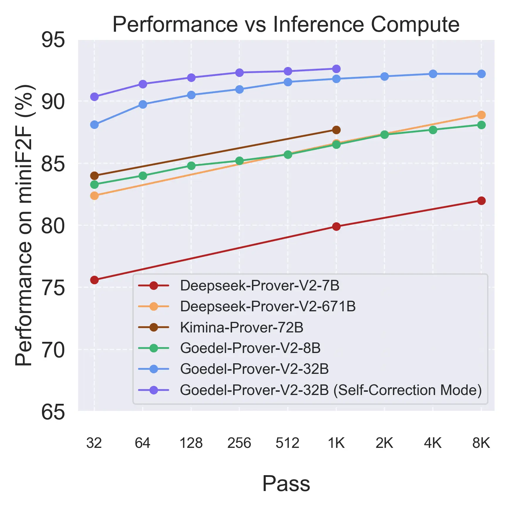 Goedel-Prover-V2-32B 在不同推理时间预算下的表现始终优于此前的技术标杆模型,展现了其在长时间、多步推理任务中的稳定性与扩展性。