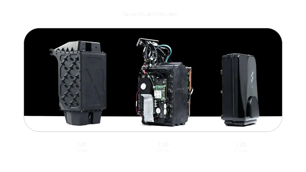 Figure 从最初代号为 F.01 的原型机器人开始,就致力于打造专为人形机器人定制的电池系统。F.01 使用的是笨重的矩形模块,只能以“背包”形式挂载在机器人背部。