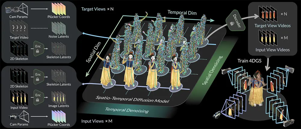 - 姿态条件机制:将 3D 人体骨骼序列投影到每个视角和时间戳上,作为条件信号输入扩散模型,增强生成视频的姿态准确性和视觉质量。