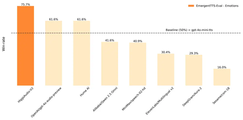 该基准通过人类盲测比较不同模型在“情感表达”和“提问语气”上的表现。Higgs Audio V2 在“情感”类别中以 75.7% 的胜率 超过 gpt-4o-mini-tts(基准为 50%),显著优于其他主流模型。