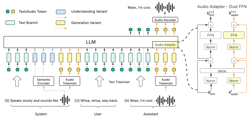 模型在 LLM 主干基础上引入双前馈网络(Dual FFN)结构,分别处理文本 token 和音频 token,并通过跨注意力模块共享信息。这种设计让模型能更高效地建模文本与声音之间的复杂关系。