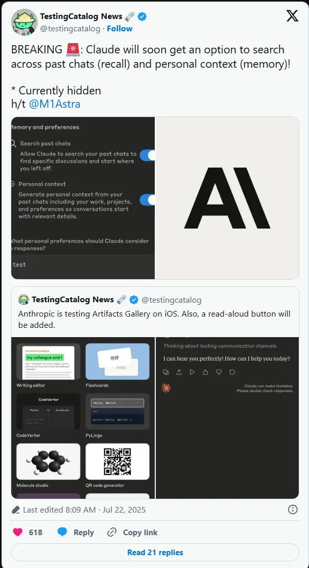过去,Claude 因功能迭代较慢,在移动端体验上落后于 ChatGPT 和 Gemini。但此次更新表明,团队正加速补齐短板,尤其是在: