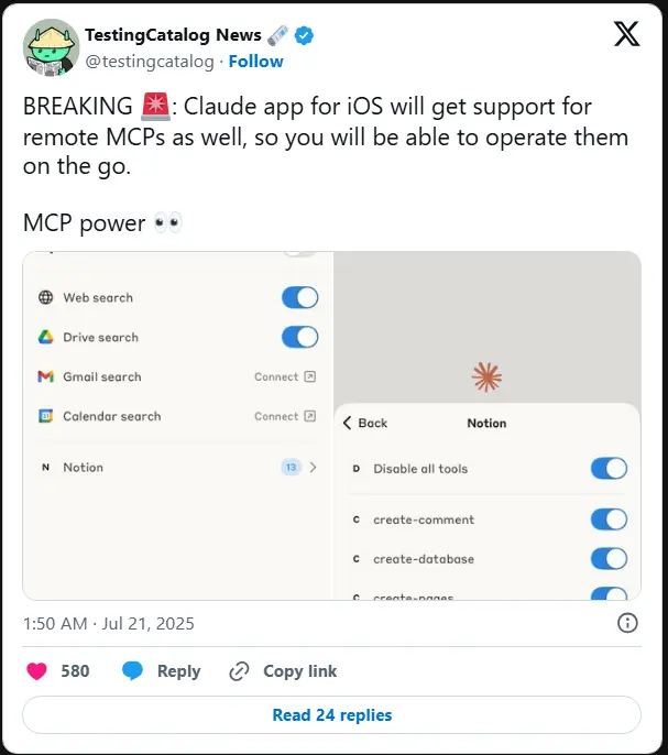 截至目前,MCP 功能仅支持网页端。而此次代码更新表明,移动端也将获得远程 MCP 访问权限。