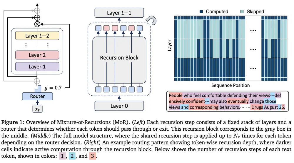 “MoR 本质上使模型能够基于每个 token 高效调整其思考深度,统一了参数效率与自适应计算。”