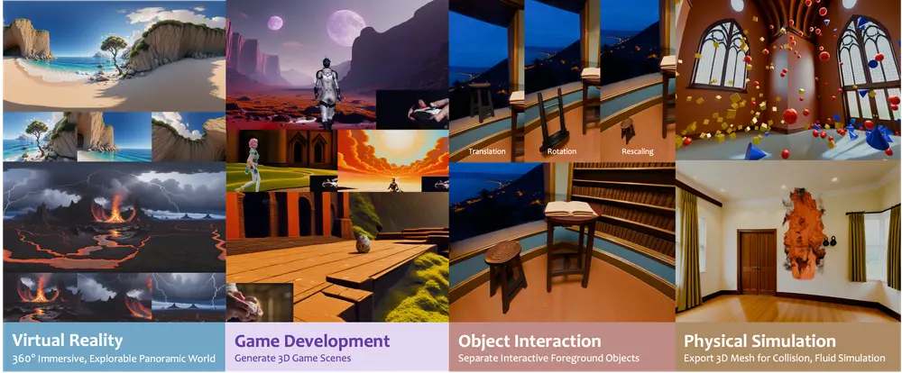HunyuanWorld 1.0 的设计目标明确:生成的不仅是静态画面,而是可沉浸、可探索、可交互的三维环境。其三大核心优势如下: