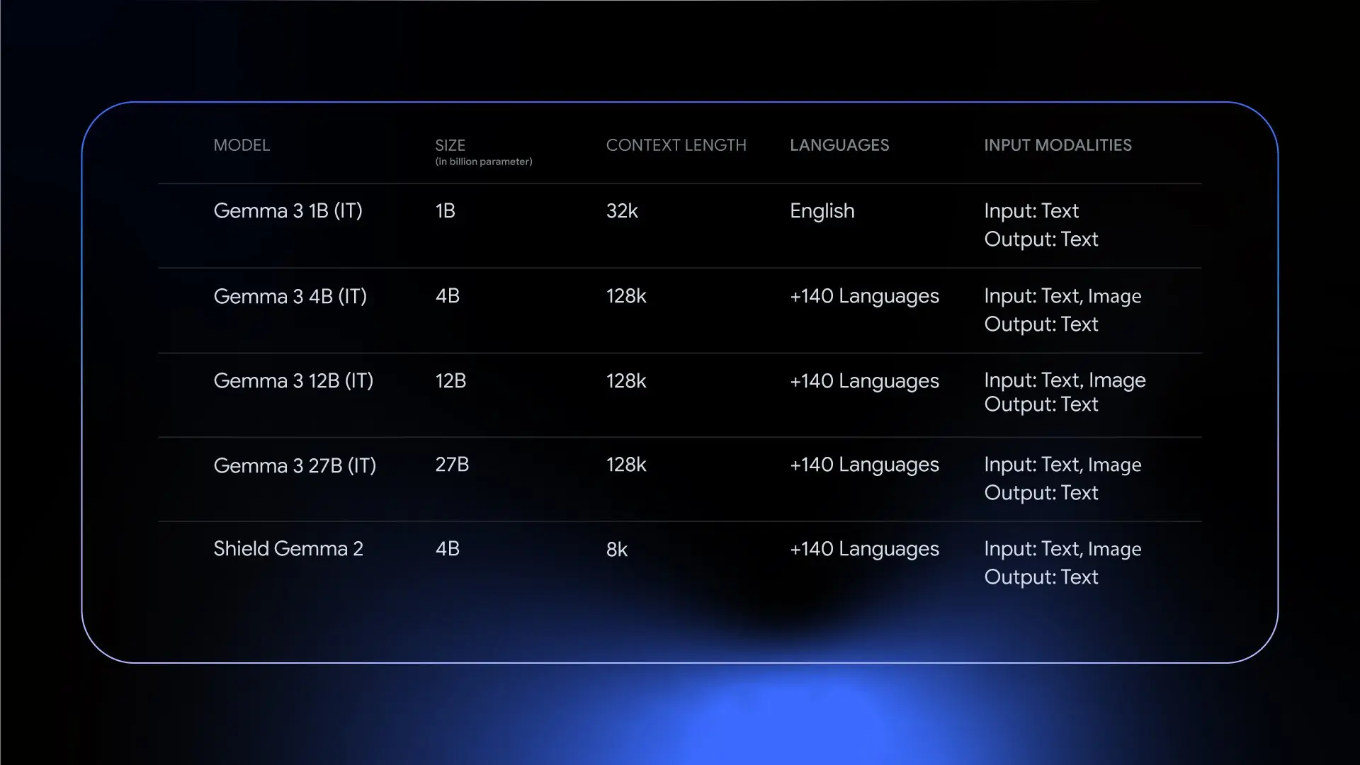 Gemma 3 提供四种规模(1B、4B、12B 和 27B),以及从 32 位全精度到 4 位最低精度的五种精度级别。开发者可以根据任务需求和计算资源选择最适合的模型规模和精度,实现性能与效率的平衡。
