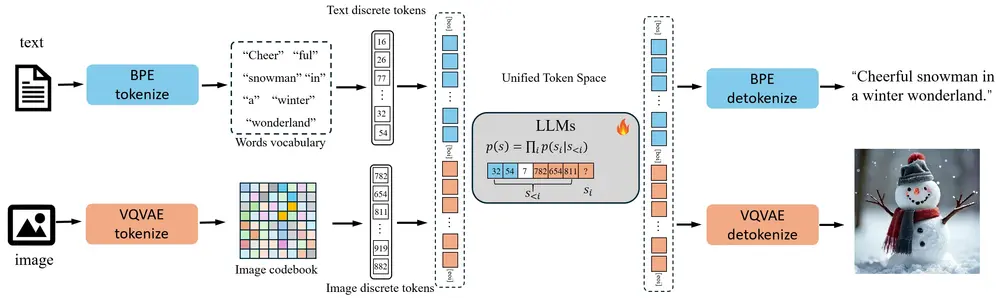 图像编码:使用 VQGAN(Vector Quantized Generative Adversarial Network)将图像编码为离散的令牌,类似于 BPE(Byte Pair Encoding)对文本的处理。 统一嵌入空间:将图像令牌和文本令牌统一到一个共享的嵌入空间中,使模型能够同时处理视觉和语言任务。 继续训练:基于现有的 LLMs,通过少量的高质量图像-文本对数据进行继续训练,提升模型的多模态能力。 多模态任务优化:通过统一的令牌空间,使视觉生成和理解任务能够相互增强,而不是相互干扰。