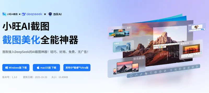 小旺AI截图是首款接入DeepSeek大模型的AI截图神器,核心优势集中在「轻巧、免费、无广告、功能全」——安装包比同类软件小80%,无需登录即可使用,所有功能终身免费,且不接入任何第三方广告,提供纯净无干扰的使用体验。