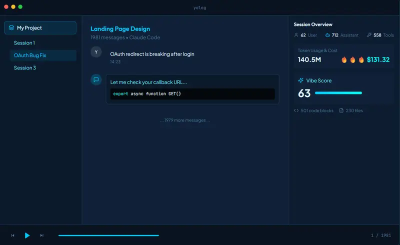 开发者 Yuanhao 正是为此打造了 yolog.dev Desktop —— 一个专为 AI 编程会话设计的桌面应用,让“氛围”的产出可回溯、可搜索、可复用。