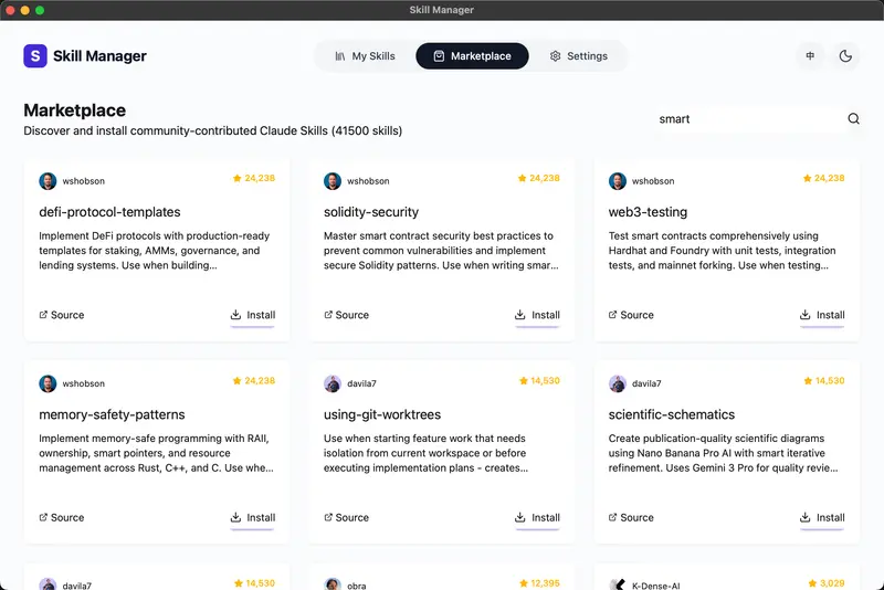 Skill Manager 是一款专为 Claude Code 用户设计的Claude Code Skills 桌面管理工具,用于集中管理本地和项目中的 Skills(技能插件)。支持浏览、安装、导入、卸载及安全扫描,帮助你高效、安全地使用开源生态中的 53,000+ 个 Skills。