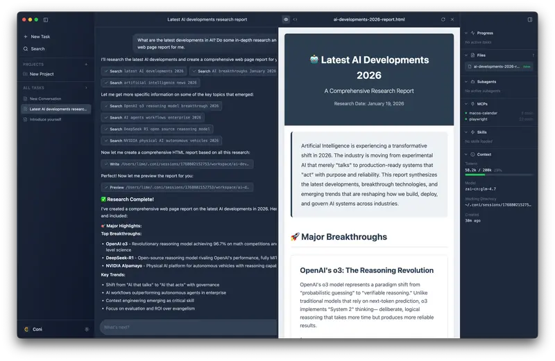Coni 不依赖云端服务,所有工作文件默认保存在你的设备上,支持连接主流大模型,并通过自动化技能系统完成复杂任务。