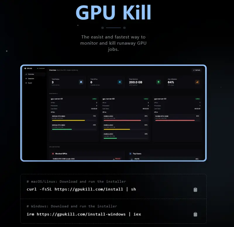 GPU Kill 是一款功能全面的命令行工具,主打跨厂商 GPU 全生命周期管理,可适配英伟达、AMD、英特尔及 Apple Silicon 系统,能轻松实现 GPU 监控、进程管控、安全防护等核心能力,是管理 GPU 基础设施的高效工具。
