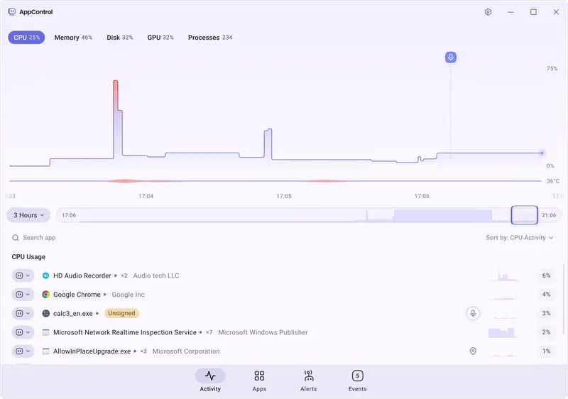 这一点真的太关键了。就像刚才说的,性能尖峰往往转瞬即逝,等你打开监控工具,早就恢复正常了。但AppControl能记录下过去的资源使用情况,哪怕是几分钟、几小时前的异常,你都能翻回去查,清楚看到当时是哪个应用在偷偷占用CPU、内存、显卡或者磁盘。