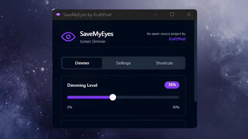 SaveMyEyes 是一款轻量级跨平台桌面工具,通过软件覆盖层实现屏幕调光,支持 0%~90% 亮度调节、多显示器独立配置,并能自动从截图与屏幕录制中隐藏,兼顾视觉舒适与内容分享的便利性。