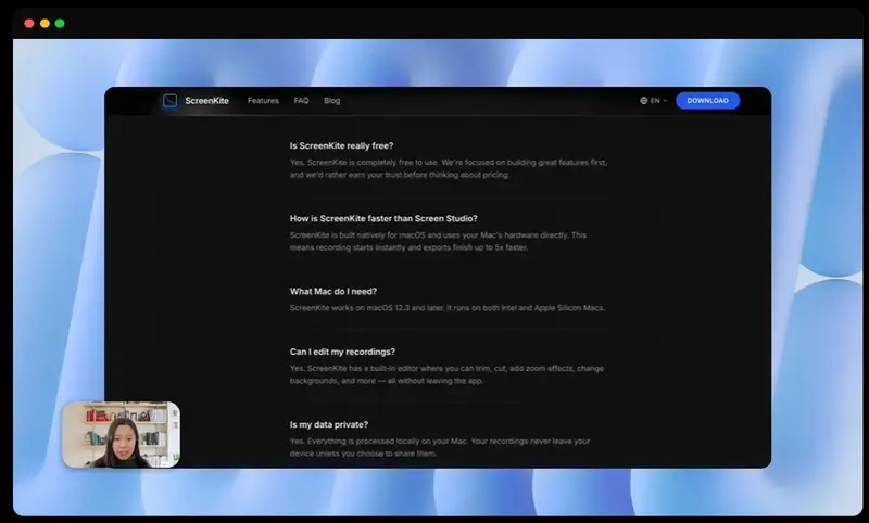 ScreenKite 是一款完全免费的原生 macOS 应用,定位为 Screen Studio 的开源替代方案:支持录制、编辑、分享一体化流程,主打自动缩放、快速导出与本地隐私保护。没有 Electron 封装,没有卡顿,也没有隐藏收费。