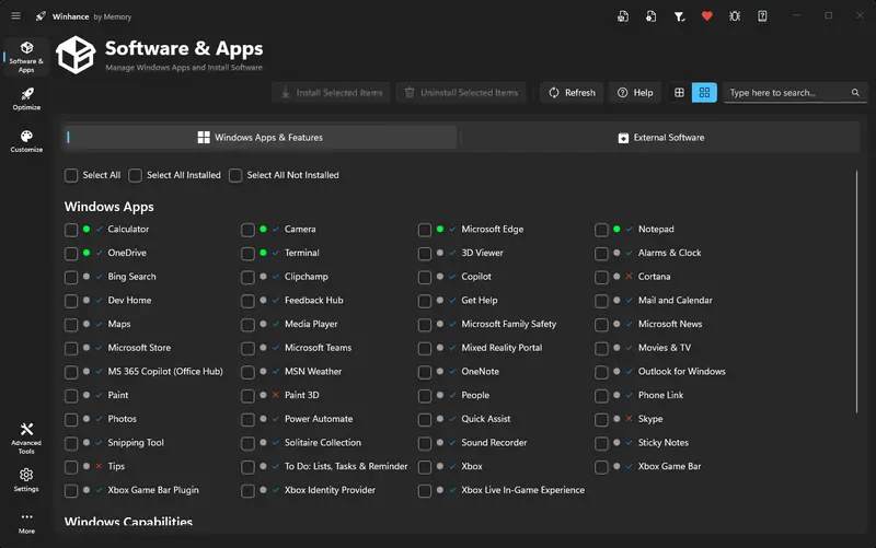 Winhance 提供了强大的应用管理面板,让你轻松清理系统垃圾: