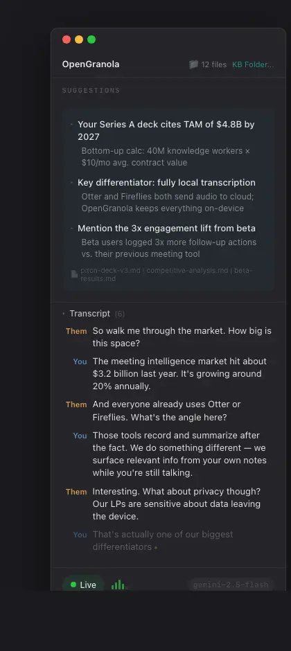 .md) 或文本 (.txt) 的文件夹(如 Obsidian 库、Notion 导出文件)。 - 实时上下文匹配:当对话提及特定项目、客户或技术参数时,OpenOats 会自动在本地知识库中检索相关片段。